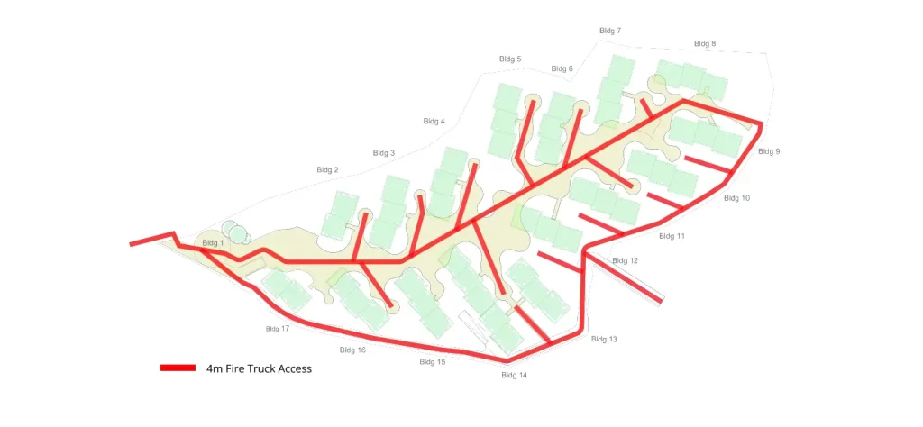 The design allows for an efficient layout, with residents able to enter from either the eastern or western side of the residence, providing easy access to all buildings.